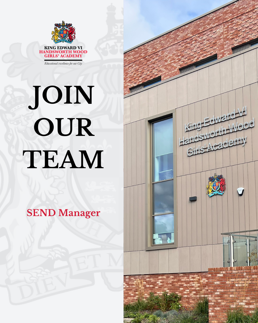 Welcome to King Edward VI Handsworth Wood Girls’ Academy! We are an 11-18 non-selective comprehensive school on the north-west of Birmingham. Our dedicated and passionate staff are at the heart of our vibrant school community. Each member of our team is committed to providing a supportive and enriching environment where every student can thrive academically, socially, and personally.